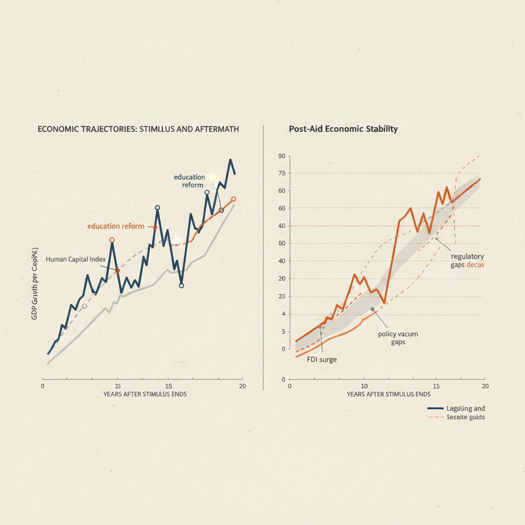 ![clean data visualization, flat 2D chart, muted academic palette, no 3D effects, evidence-based presentation, professional infographic, minimal decoration, clear axis labels, scholarly aesthetic, a split-line economic chart on matte archival paper, ink and fine graphite lines, light from upper left casting subtle shadow on data points, atmosphere of quiet revelation—left panel shows a rising trend with labeled inflection points: 'education reform', 'FDI surge'; right panel shows flatlining post-aid with gaps in institutional response, both sharing the same x-axis: 'years after stimulus ends' [Nano Banana] clean data visualization, flat 2D chart, muted academic palette, no 3D effects, evidence-based presentation, professional infographic, minimal decoration, clear axis labels, scholarly aesthetic, a split-line economic chart on matte archival paper, ink and fine graphite lines, light from upper left casting subtle shadow on data points, atmosphere of quiet revelation—left panel shows a rising trend with labeled inflection points: 'education reform', 'FDI surge'; right panel shows flatlining post-aid with gaps in institutional response, both sharing the same x-axis: 'years after stimulus ends' [Nano Banana]](https://081x4rbriqin1aej.public.blob.vercel-storage.com/viral-images/00bf7255-f7b7-4f40-b822-f86144eaee98_viral_4_square.png)