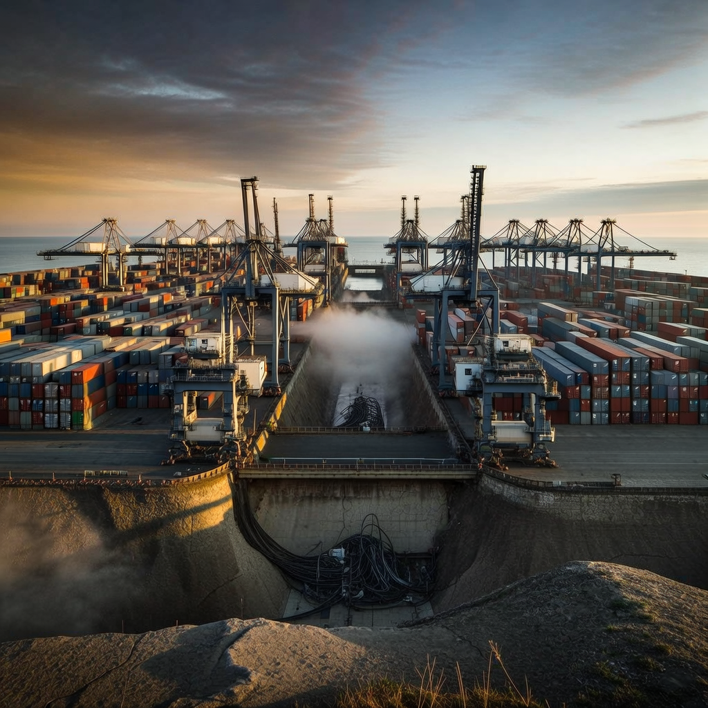 ![industrial scale photography, clean documentary style, infrastructure photography, muted industrial palette, systematic perspective, elevated vantage point, engineering photography, operational facilities, A sprawling container port at dawn, viewed from a high coastal bluff, stretching endlessly into the horizon under a divided sky. Rows of cranes and shipping stacks form rigid, repeating patterns in steel-gray and matte blue, their shadows long and sharp from low eastern light. To the west, stacks are draped in warm, fading amber glow, containers slightly weathered, labels in mixed scripts. To the east, identical rows stand in precise order under cool artificial lighting, freshly painted, no markings visible. Between them, a deep, shadowed maintenance channel cuts through the terminal—dry, cracked at the bottom, too wide to cross—where twisted remnants of fiber-optic conduits and severed cable housings lie abandoned. Morning mist clings low, diffusing the light but not bridging the divide. [Bria Fibo] industrial scale photography, clean documentary style, infrastructure photography, muted industrial palette, systematic perspective, elevated vantage point, engineering photography, operational facilities, A sprawling container port at dawn, viewed from a high coastal bluff, stretching endlessly into the horizon under a divided sky. Rows of cranes and shipping stacks form rigid, repeating patterns in steel-gray and matte blue, their shadows long and sharp from low eastern light. To the west, stacks are draped in warm, fading amber glow, containers slightly weathered, labels in mixed scripts. To the east, identical rows stand in precise order under cool artificial lighting, freshly painted, no markings visible. Between them, a deep, shadowed maintenance channel cuts through the terminal—dry, cracked at the bottom, too wide to cross—where twisted remnants of fiber-optic conduits and severed cable housings lie abandoned. Morning mist clings low, diffusing the light but not bridging the divide. [Bria Fibo]](https://081x4rbriqin1aej.public.blob.vercel-storage.com/viral-images/67a20813-db6e-446a-9890-863a8ad10c37_viral_3_square.png)