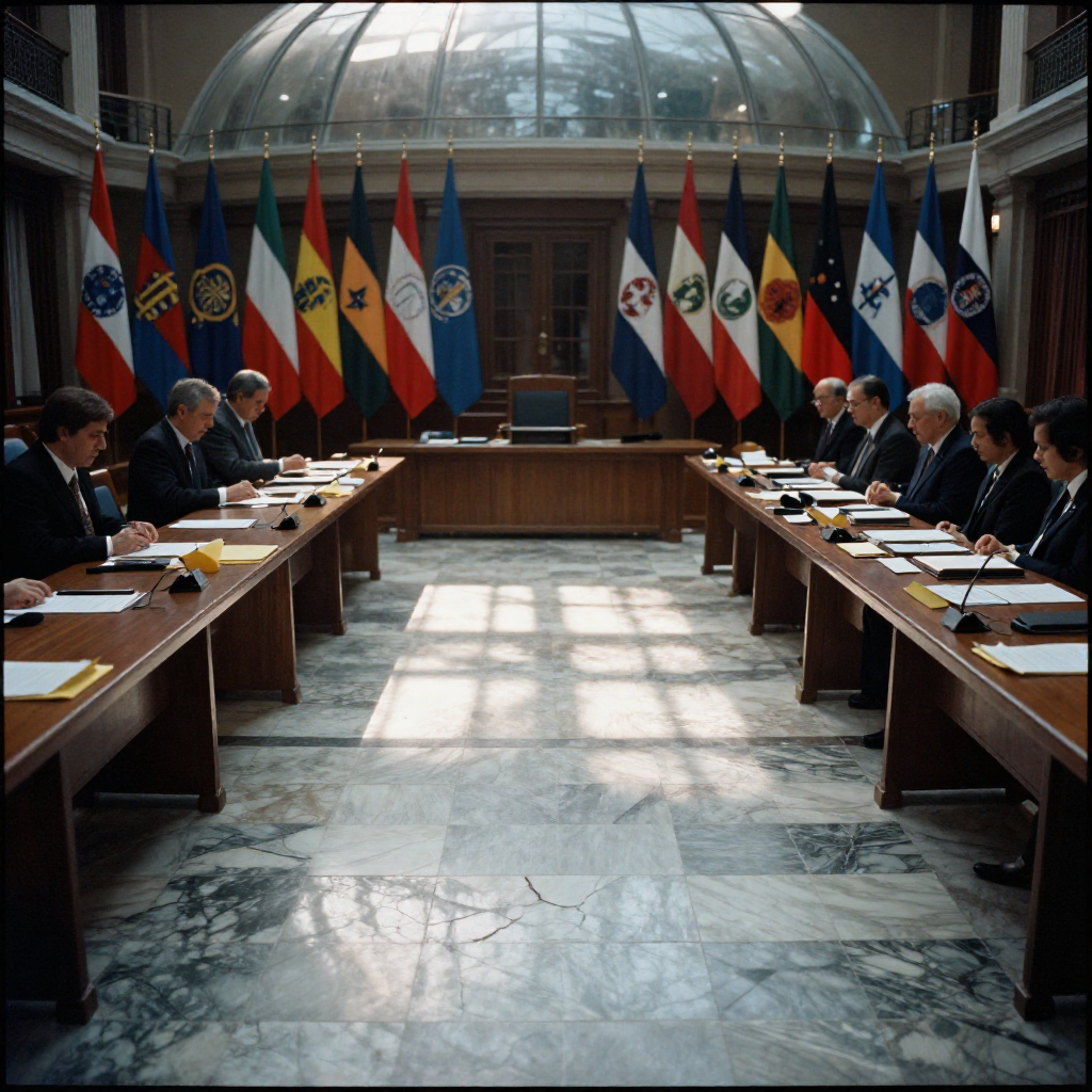 ![muted documentary photography, diplomatic setting, formal atmosphere, institutional gravitas, desaturated color palette, press photography style, 35mm film grain, natural lighting, professional photojournalism, An empty treaty chamber at dusk, cracked marble floor reflecting fractured shafts of side light, draped national flags hanging motionless under a dust-covered glass dome, unsigned digital trade accords scattered across long oak tables, their paper yellowing at the edges, atmosphere of suspended finality [Z-Image Turbo] muted documentary photography, diplomatic setting, formal atmosphere, institutional gravitas, desaturated color palette, press photography style, 35mm film grain, natural lighting, professional photojournalism, An empty treaty chamber at dusk, cracked marble floor reflecting fractured shafts of side light, draped national flags hanging motionless under a dust-covered glass dome, unsigned digital trade accords scattered across long oak tables, their paper yellowing at the edges, atmosphere of suspended finality [Z-Image Turbo]](https://081x4rbriqin1aej.public.blob.vercel-storage.com/viral-images/bb3f17d7-34ea-4a14-8daa-90b30a72e164_viral_0_square.png)