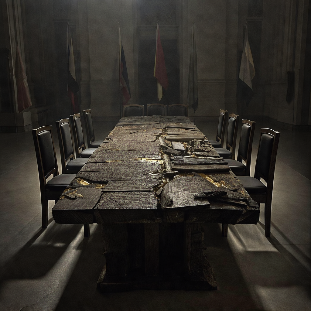![muted documentary photography, diplomatic setting, formal atmosphere, institutional gravitas, desaturated color palette, press photography style, 35mm film grain, natural lighting, professional photojournalism, A long, solemn treaty table carved from layered urban debris—charred timber from Chicago, cracked stone from Lisbon—its surface etched with fading treaty text and seismic fissures now filled with gold resin, lit by low side light casting elongated shadows of empty chairs, the air still and heavy with unspoken commitments, in a grand but dimly lit hall where flags hang limp and the weight of renewal rests not on signatures, but on silence [Bria Fibo] muted documentary photography, diplomatic setting, formal atmosphere, institutional gravitas, desaturated color palette, press photography style, 35mm film grain, natural lighting, professional photojournalism, A long, solemn treaty table carved from layered urban debris—charred timber from Chicago, cracked stone from Lisbon—its surface etched with fading treaty text and seismic fissures now filled with gold resin, lit by low side light casting elongated shadows of empty chairs, the air still and heavy with unspoken commitments, in a grand but dimly lit hall where flags hang limp and the weight of renewal rests not on signatures, but on silence [Bria Fibo]](https://081x4rbriqin1aej.public.blob.vercel-storage.com/viral-images/bb51664e-cbb1-40c4-9196-d46ff81a9a0e_viral_0_square.png)