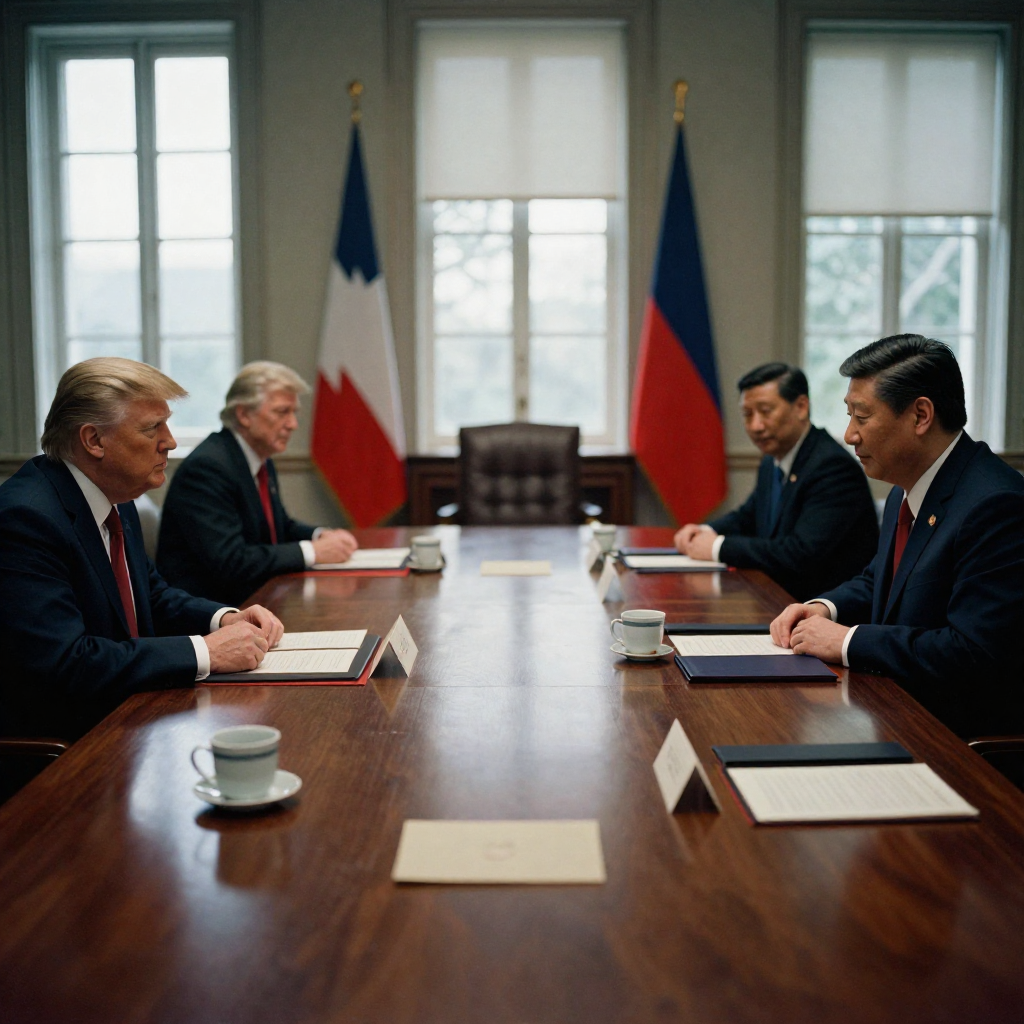 ![muted documentary photography, diplomatic setting, formal atmosphere, institutional gravitas, desaturated color palette, press photography style, 35mm film grain, natural lighting, professional photojournalism, an empty summit table set for bilateral talks, polished mahogany surface with place cards for Trump and Xi, draped in muted navy and crimson fabric, a single unsealed treaty envelope resting beside a cold, unused teacup, side-lit by narrow institutional windows casting long shadows, atmosphere of anticipatory stillness and unresolved tension [Z-Image Turbo] muted documentary photography, diplomatic setting, formal atmosphere, institutional gravitas, desaturated color palette, press photography style, 35mm film grain, natural lighting, professional photojournalism, an empty summit table set for bilateral talks, polished mahogany surface with place cards for Trump and Xi, draped in muted navy and crimson fabric, a single unsealed treaty envelope resting beside a cold, unused teacup, side-lit by narrow institutional windows casting long shadows, atmosphere of anticipatory stillness and unresolved tension [Z-Image Turbo]](https://081x4rbriqin1aej.public.blob.vercel-storage.com/viral-images/e4d3a044-db25-4ec5-a95d-8ce65f2f4113_viral_0_square.png)