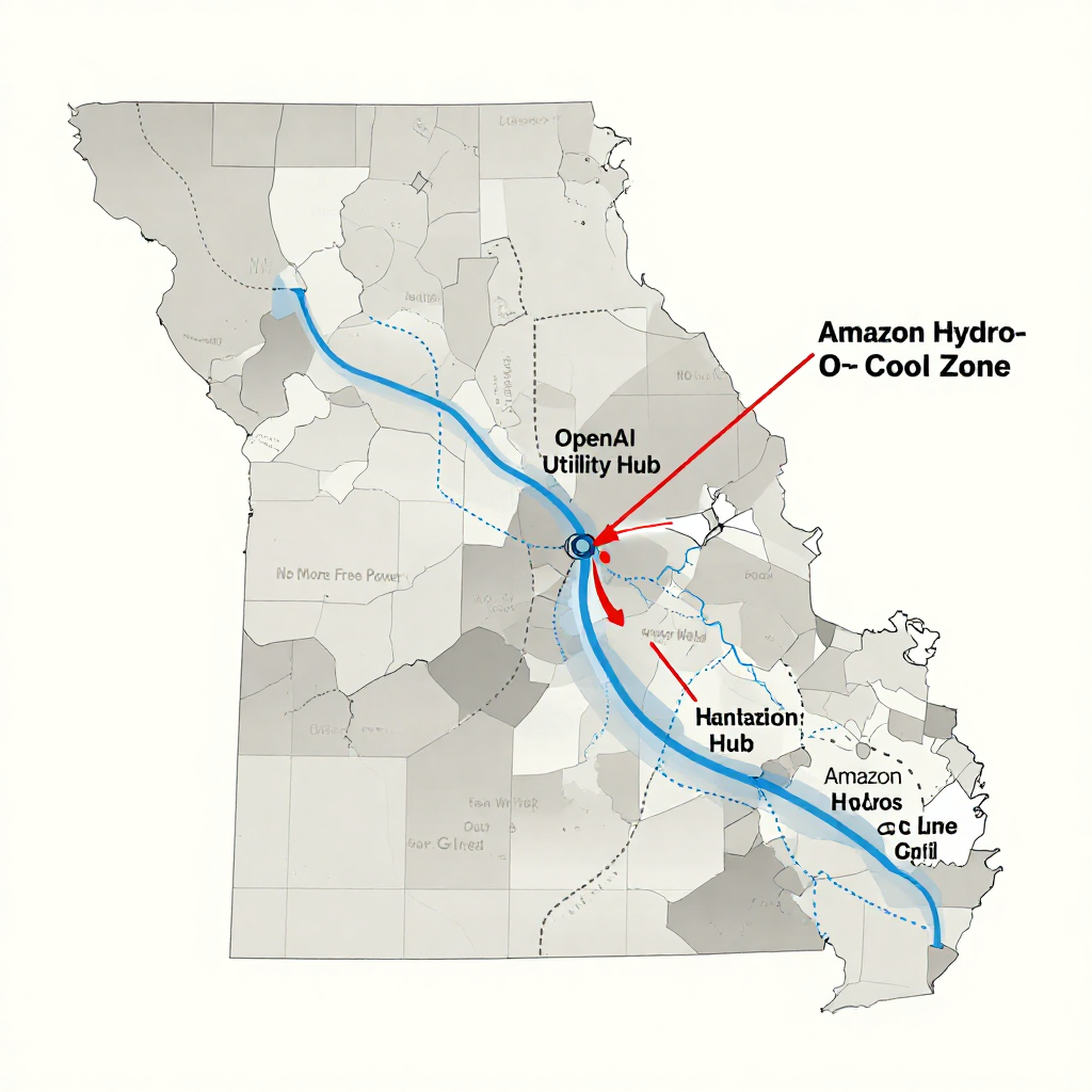 ![flat color political map, clean cartographic style, muted earth tones, no 3D effects, geographic clarity, professional map illustration, minimal ornamentation, clear typography, restrained color coding, flat 2D political map of Missouri with St. Charles at the epicenter, river networks rendered in fading blue ink that thins into dashed lines as they approach data center zones, red annotation arrows siphoning water toward tech enclaves labeled 'OpenAI Utility Hub' and 'Amazon Hydro-Cool Zone', subtle gradient shading showing power subsidy corridors in gray, faint handwritten protest notations along county lines ('No More Free Power', 'Our Water, Our Grid'), overhead view with even top-down lighting, atmosphere of bureaucratic inevitability [Z-Image Turbo] flat color political map, clean cartographic style, muted earth tones, no 3D effects, geographic clarity, professional map illustration, minimal ornamentation, clear typography, restrained color coding, flat 2D political map of Missouri with St. Charles at the epicenter, river networks rendered in fading blue ink that thins into dashed lines as they approach data center zones, red annotation arrows siphoning water toward tech enclaves labeled 'OpenAI Utility Hub' and 'Amazon Hydro-Cool Zone', subtle gradient shading showing power subsidy corridors in gray, faint handwritten protest notations along county lines ('No More Free Power', 'Our Water, Our Grid'), overhead view with even top-down lighting, atmosphere of bureaucratic inevitability [Z-Image Turbo]](https://081x4rbriqin1aej.public.blob.vercel-storage.com/viral-images/f845835d-b091-4c31-9a54-b626288bc1f3_viral_1_square.png)